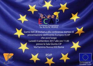Lunedì 4 settembre 2017 alle ore 11:00 si terrà la Conferenza Stampa di presentazione dell’Evento Europeo “ECAP – European Competion for Autistic People” presso la Sala Giunta CIP, via Flaminia Nuova 830, Roma.