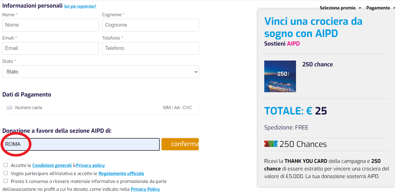 ►inserisci nel campo “Donazione a favore della sezione AIPD di:” il nome ROMA (in maiuscolo!)