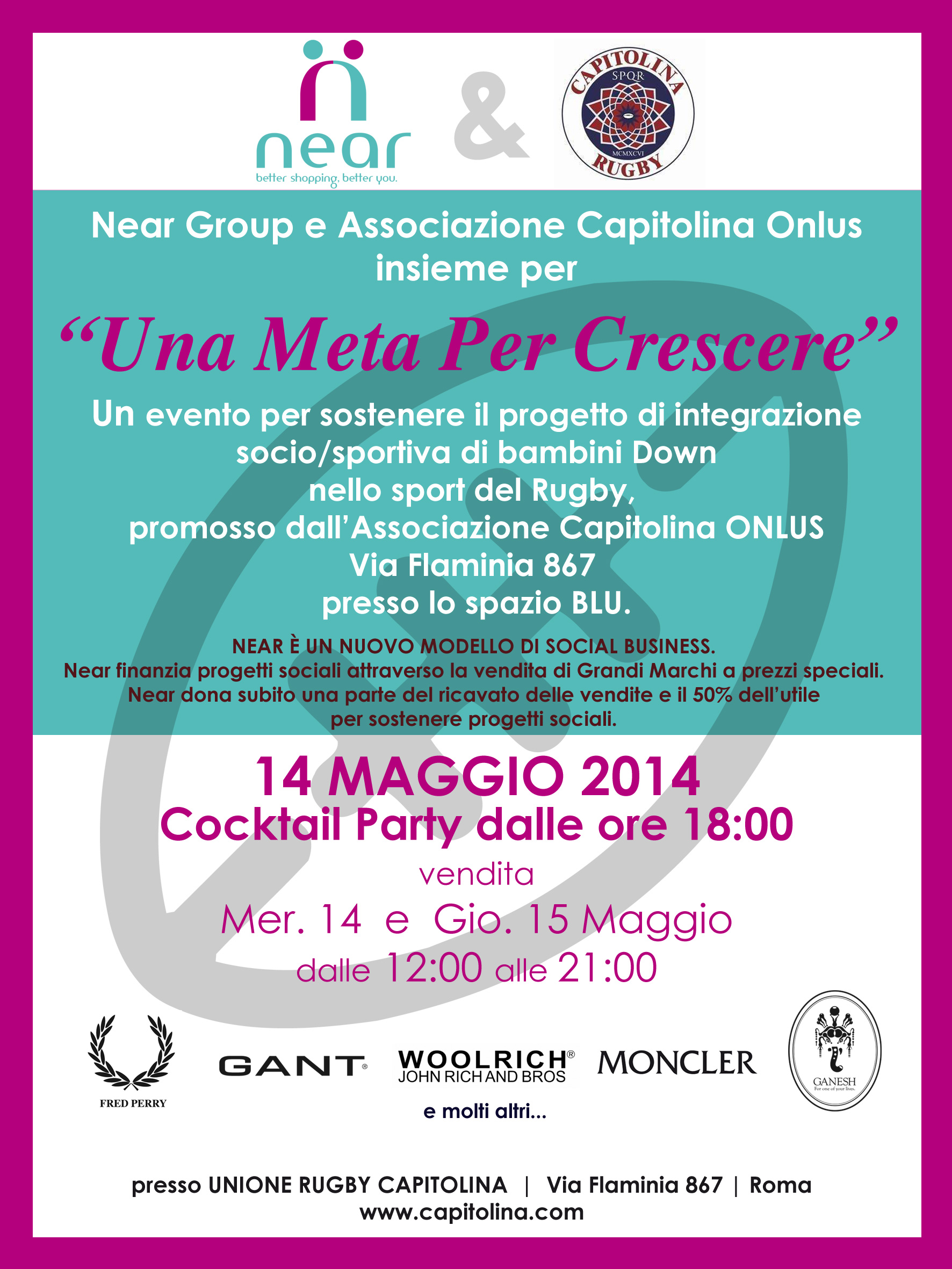 Mercoledì 14 e giovedì 15 maggio, presso lo spazio Blu, in via Flaminia 867, si svolgerà un evento di raccolta fondi per il progetto di integrazione sportiva “Una meta per crescere“.