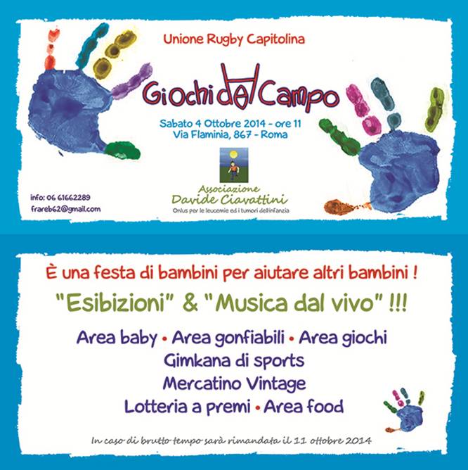 Il 4 ottobre, dalle ore 11 al tramonto, presso l’Unione Rugby Capitolina, si svolgerà l’ormai consueta festa dei Giochi del Campo. Quest’anno la manifestazione, dedicata a tutti grandi e piccoli, compie undici anni. Ci saranno tante sorprese, esibizioni e musica dal vivo, oltre il solito mercatino Vintage, area giochi, area food, gimkana di sport e lotteria!