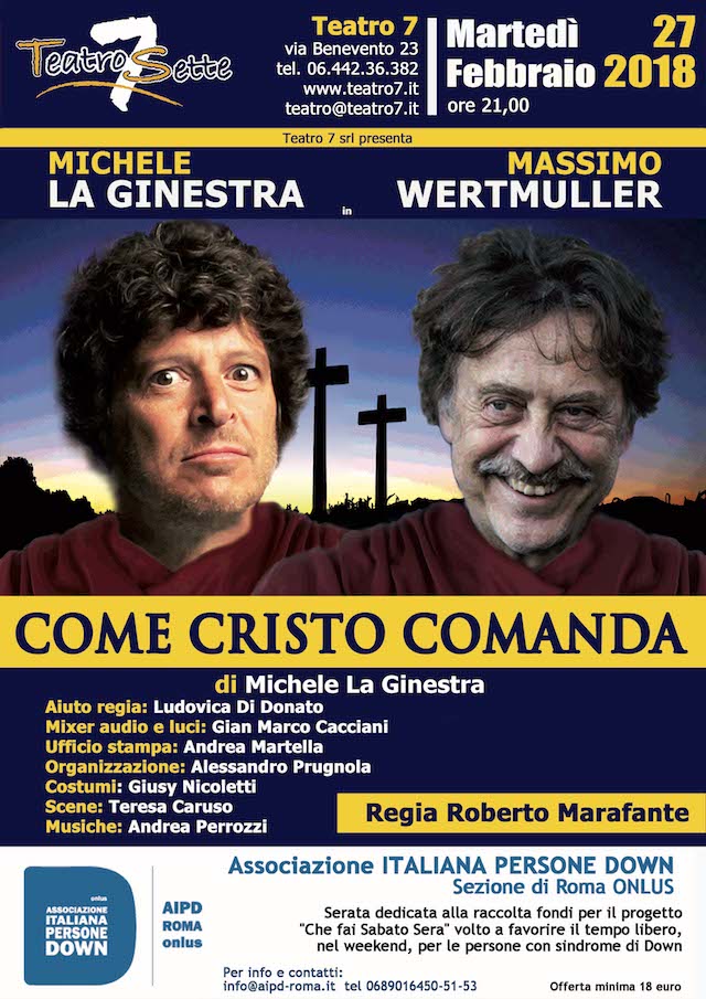 Martedì 27 febbraio, alle ore 21.00, al Teatro 7, in via Benevento 23, andrà in scena “Come Cristo comanda“, con Michele La Ginestra e Massimo Wertmuller , una commedia di Michele La Ginestra, regia di Roberto Marafante.