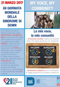 #MyVoiceMyCommunity – la mia voce, la mia comunità: sostenere il diritto delle persone con sindrome di Down a “farsi sentire” ed essere ascoltati, questo il tema dell’edizione 2017.